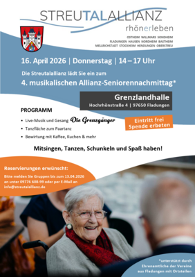 Eine Anmeldung einzelner Personen ist nicht erforderlich. Reservierungen von größeren Gruppen werden bis zum 13.04.2026 gern entgegengenommen unter Telefonnummer 09776/608-99 oder per E-Mail an info(at)streutalallianz.de entgegengenommen.