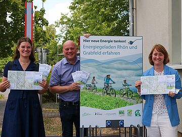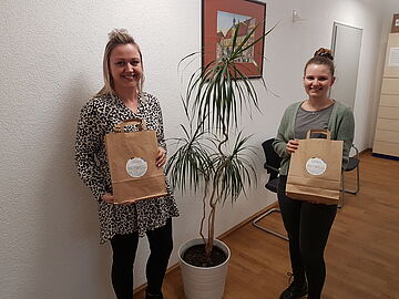 Judith Diemer und Hanna Weber vom Bürgeramt der Verwaltungsgemeinschaft Ostheim v.d.Rhön sowie die Bürgermeister der Verwaltung präsentieren die „Willkommenstüte“ für Neubürgerinnen und Neubürger. Dieser besondere Willkommensgruß hat sich aus dem Workshop „Willkommenskultur Rhön-Grabfeld“, der auf Initiative des Landkreises Rhön-Grabfeld zusammen mit den Städten und Gemeinden im Landkreis durchgeführt wurde, entwickelt.