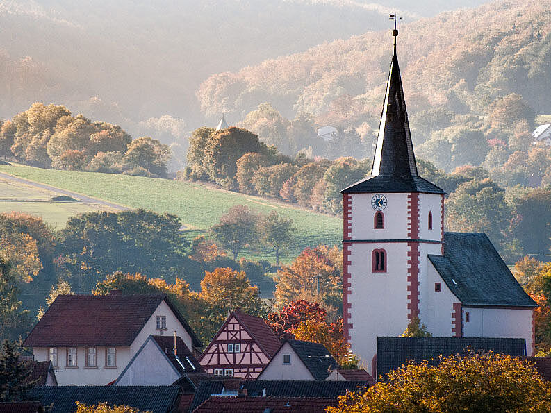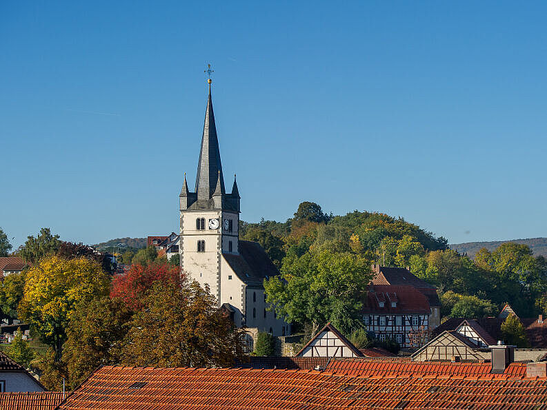 Die Kirche stammt aus dem 15. Jahrhundert und wurde 1605 erweitert. An der Südseite findet man eine spätgotische Kapelle von 1512 mit Treppenturm zur Empore. Auf der Bretterdecke ist ein großes Gemälde zur Himmelfahrt Christi von Johann Peter Herrlein aus dem Jahr 1775; an den Emporen sind Ölgemälde mit Bildern aus dem Alten und Neuen Testament; es gibt einene schön ausgeschmückten Kanzelaltar, die Bildhauerarbeiten sind von Caspar Hippeli, farbig gefasst von Herrlein im Jahr 1775. Der ursprüngliche Zustand wurde bei der Renovierung 1987/89 weitgehend wieder hergestellt. Taufstein aus dem Jahre 1606 von Balthasar Eckhard und Heinrich Eckard, rundum bedeckt mit Relief des Unterganges der Ägypter im Roten Meer; Opferstock von 1606; Von der 1819 von Johann Georg Oestereich und Johann Adam Oestereich erbauten Orgel sind auch große Teile des Werks erhalten. Ein Glasgemälde in Form einer kleinen Rundscheibe mit heiligem Petrus um 1500 im Fenster an der Nordseite ist sehenswert.